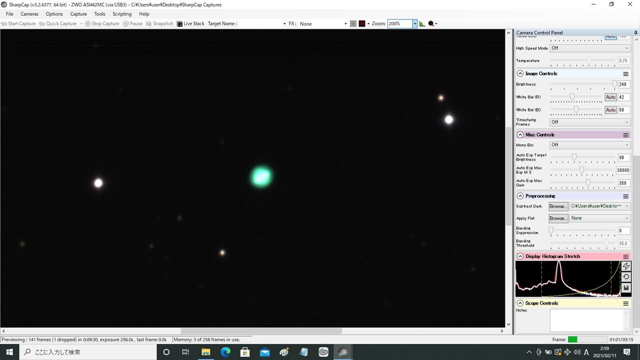 Gain400に上げて、70スタックまで頑張ってみましたが、本来なら青緑が赤の縁取りで見える、ふくろうの鮮やかな色彩が見る影もありません。外へ出て空を見ると、既に1等星しか見えない完全な薄曇り。逆にこの条件でよくここまで見えたなと(笑)